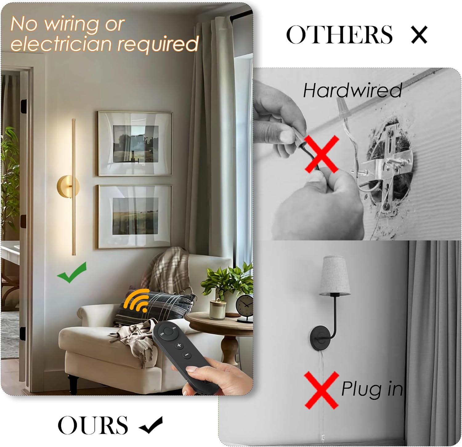 - Wireless Wall Sconce, Easy to Install: Indoor battery operated LED wall lights require no wiring and no electrician, and all mounting hardware is included for quick and easy installation of battery wall sconces